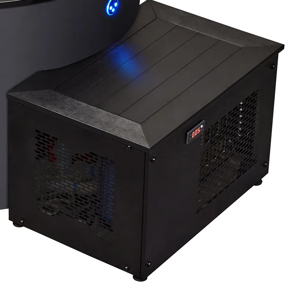 Модель оснащена производительной системой холодного водоснабжения мощностью 1 л.с., которая поддерживает заданную низкую температуру. Особенностью комплектации является внешний блок оборудования (чиллер) с габаритами 750×515×505 мм, что упрощает монтаж и техническое обслуживание системы. Встроенная фильтрация и озонатор обеспечивают постоянную чистоту воды, предотвращая развитие бактерий.